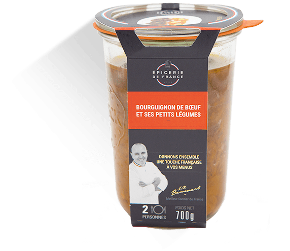 Joue de boeuf 47%, légumes 23 % (champignons, oignons, carottes), vin rouge de Madiran 10,5%, poitrine de porc fumée 9% (porc, sel, dextrose, antioxydant: E301 et conservateur : E250), eau, amidon, épices et aromates, farine de blé, concentré de tomate, sel, fond de veau (viande et jus de cuisson de veau, sel), sucre.