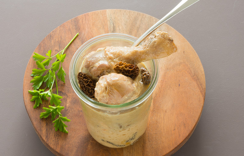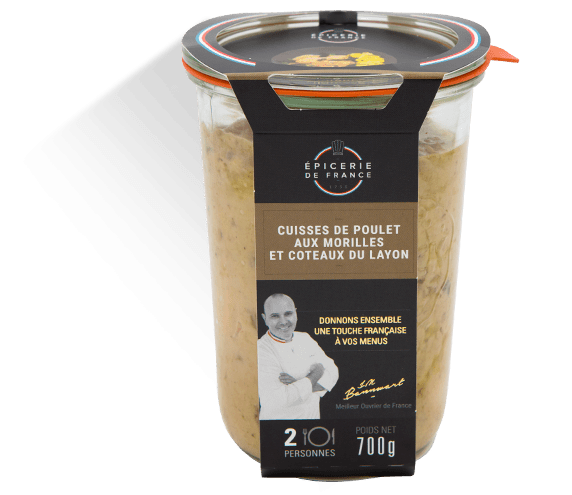 Haut de cuisse et pilon de poulet 56%, eau, crème (lait, stabilisant : carraghénanes), Coteaux du Layon 8% (sulfites), morilles 5,8%, échalote, amidon, épices et aromates, sel, fond de volaille (viande et jus de cuisson de volaille, sel).